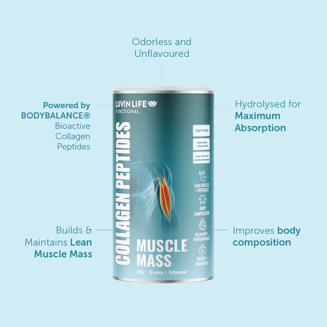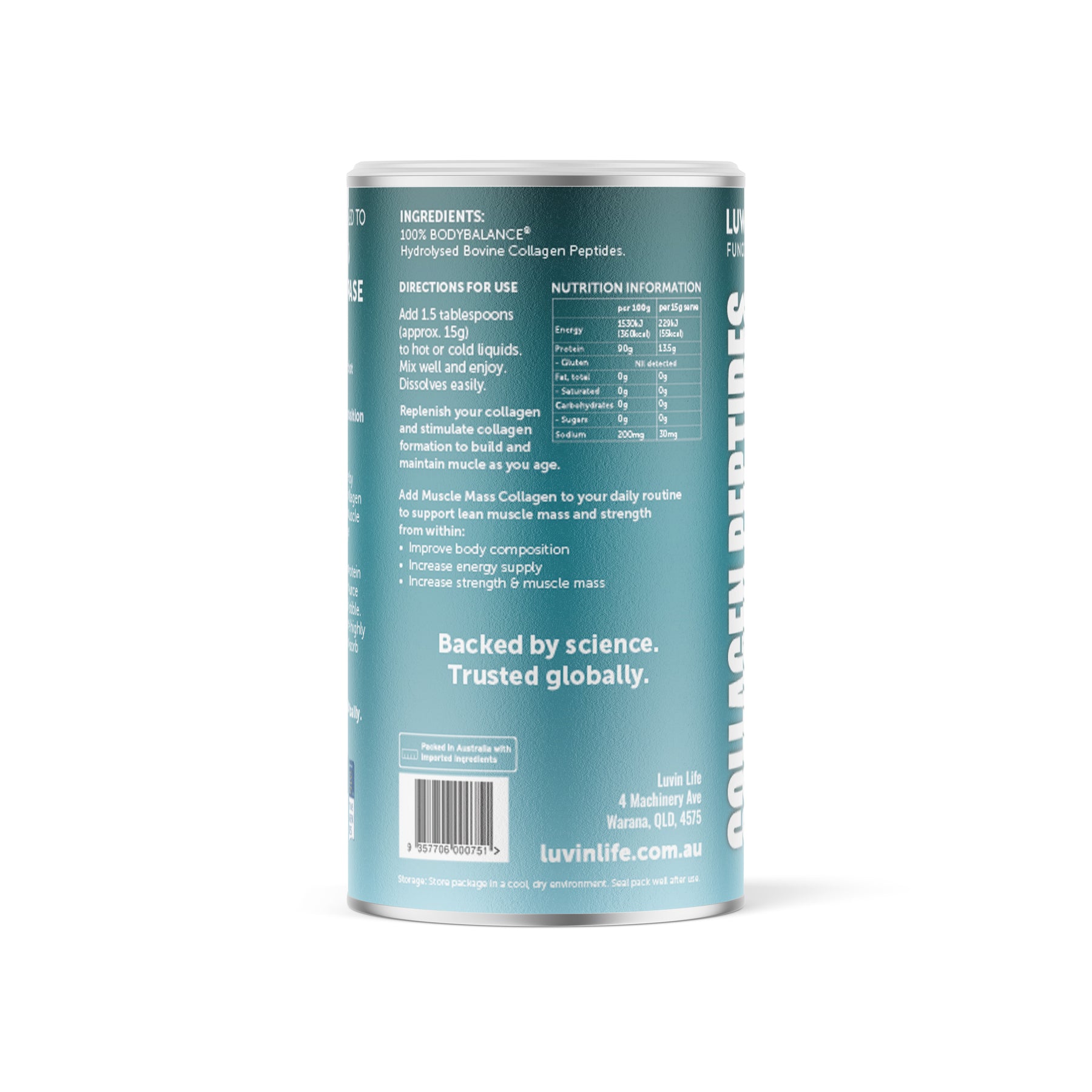 Containing 90% protein and backed by science and clinical trials, Muscle collagen has been proven to have positive effects on two main components of the human body: lean body mass and fast mass. A loss of muscle mass over the course of life time means a loss of mobility, which is followed by a loss of independence and a loss of quality of life.