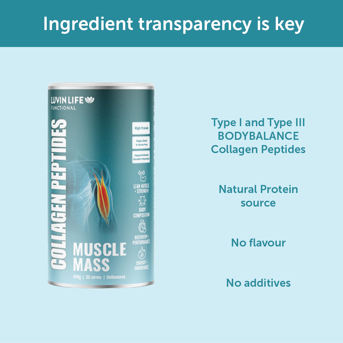 Clinically tested Muscle Mass is powered by BODYBALANCE ® the specific collagen peptides optimised to contribute to the growth and maintenance of muscle.